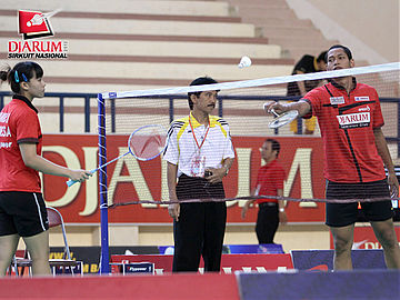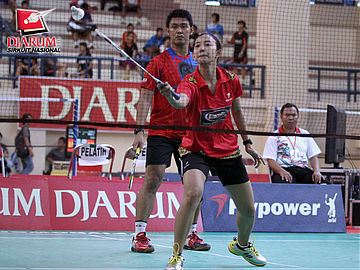Natalia Poluakan dan pasangannya asal SGS PLN Bandung, Flandy Limpele berusaha mengembalikan kok ke arah pasangan asal Nurmansyah/Siti dari PB Pelabuhan.