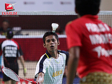 Pemain Jaya Raya Suryanaga, Fauzi Adnan berusaha mengembalikan kok kepada pemain Pusdiklat Jaya Raya, Adi Pratama.