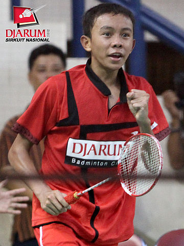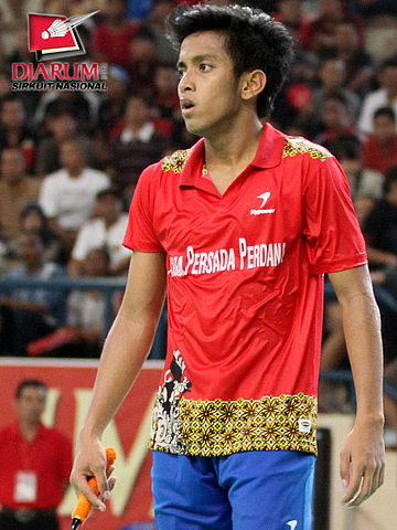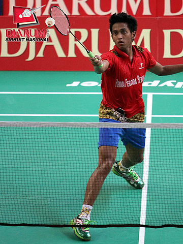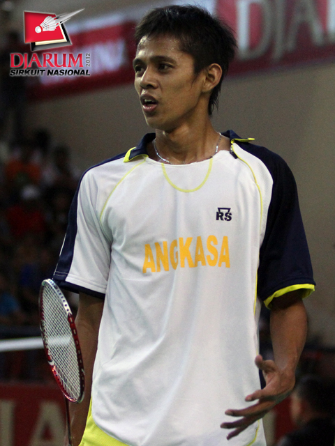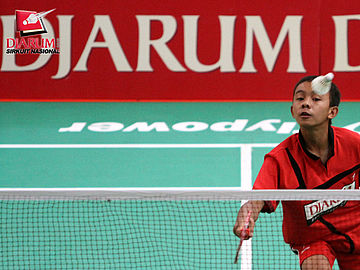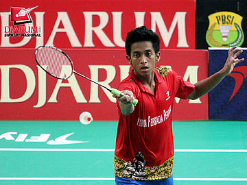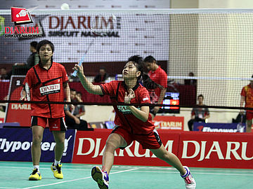 Ramadhani Zulkifli berusaha mengembalikan kok kepada kompatriotnya di PB Djarum, Joyireh Avi Manasye