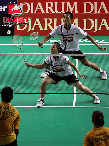 Pasangan PB Djarum, Arsya Isnanu Ardi Putra/Della Augustia Surya berusaha mengembalikan kok ke arah pemain Jaya Raya Suryanaga, Rian Swastedian/Masita Mahmudin.