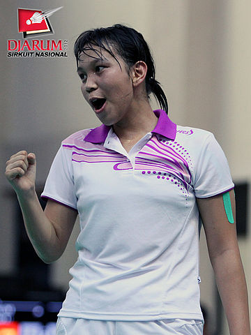 Ekspresi kemenangan Setyana Mapasa (Tangkas Alfamart) usai berhasil menjadi juara tunggal taruna putri ketika mengalahkan pemain Semen Gresik, Berliyan Sudrajat.