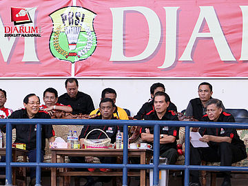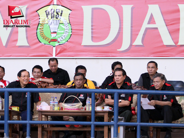 Ketua Umum PB PBSI, Djoko Santoso (tengah) beserta beberapa pengurus PBSI lain sedang menyaksikan laga final Djarum Sirkuit Nasional Kalimantan Open 2012. 8. Ekspresi pema