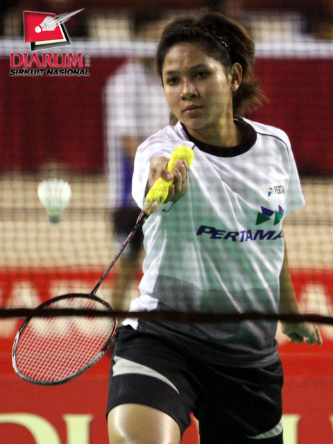 Pemain asal Pertamina Indonesia, Ganis Nur Rahmadani mengembalikan kok ke arah pemain PB Djarum, Febby Angguni.
