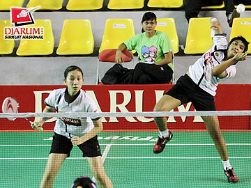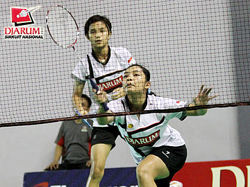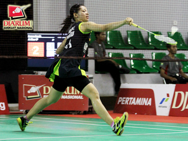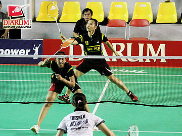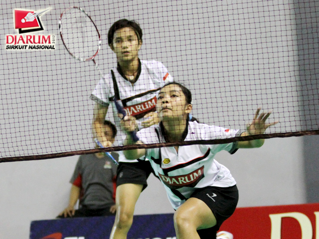 Dara Ayu (kanan) pasangannya, Tresna (PB Djarum Kudus) melepaskan smash keras kearah Mia/Firas (SGS PLN).