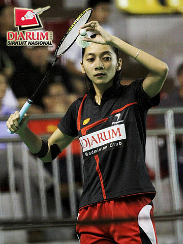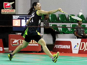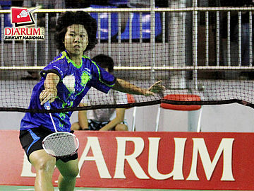 Febby Agguni (PB Djarum Kudus) saat berduel netting dengan Nur (Semen Gresik).