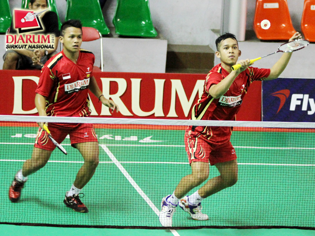 Pasangan ganda putra kelompok taruna PB Djarum Kudus, Kevin Ersa (kiri) dan Jeka bertubi-tubi melancarkan serangan.