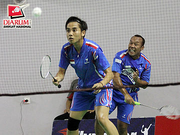 Yuda (Sarwendah) saat berusaha mengembalikan bola drop shoot yang dilepaskan Resky (PB Djarum Kudus).