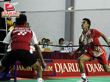 Pebulutangkis PB Djarum Kudus, Thomi Azizan (kanan) saat berduel dengan Alamsyah Yunus (Pertamina Indonesia).