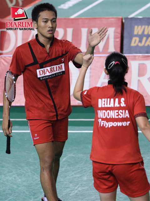 Ekspresi kemenangan pasangan pemain PB Djarum, Arsya Isnanu Ardi Putra/Della Augustia usai mengalahkan pasangan Ihsan A.W/Vicya Sandra dari Guna Dharma dengan skor 21-5 dan 21-15