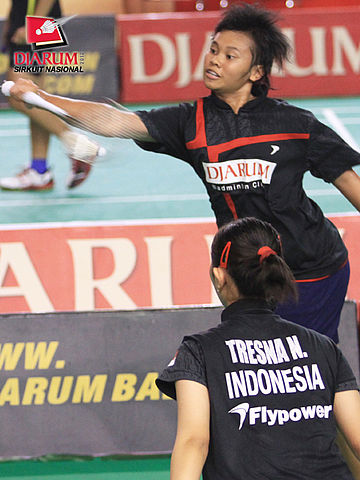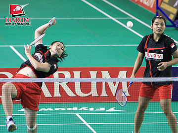 Pemain PB Djarum, Uswatun Khasanah yang berpasangan dengan Tresna Navelia C.R sedang memukul kok saat bertanding melawan pasangan Afni Fadilah/Putri Sekartaji Pungkasari dari Ragunan dalam babak perempat final Ganda Taruna Putri.