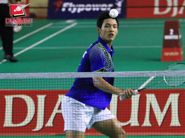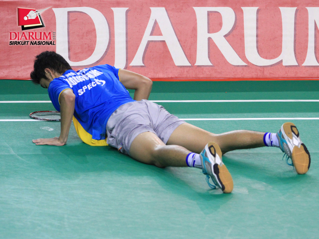 Pemain Tunggal Putra Taruna, Rico Hamdani dari Tangkas Alfamart jatuh tersungkur saat mengejar kok dari pemain PB Djarum, Ryan Fajar Satrio.