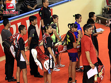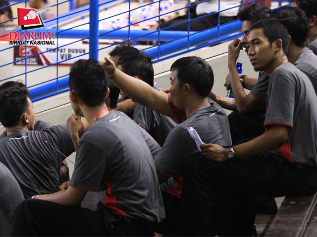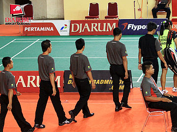 Tim referee Djarum Sirnas Jambi open 2012 sedang melakukan briefing sebelum acara pembukaan partai final dimulai.