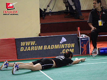 Pemain Ganda Taruna Putri, Tresna Navelia jatuh tersungkur saat berusaha mengejar kok.