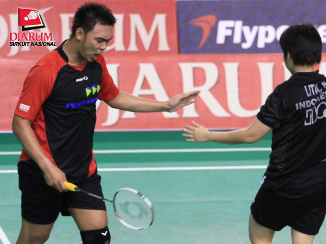 Lita Nurlita dari SGS PLN Bandung (depan) yang berpasangan dengan Ardiansyah Putra dari Pertamina Indonesia (belakang) tengah bersiap-siap untuk memukul kok dalam pertandingan final Ganda Dewasa Campuran.