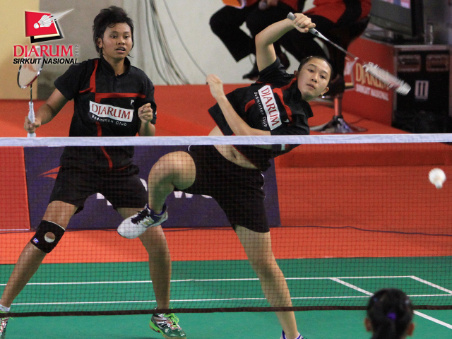 Pasangan Ganda Taruna Putri dari PB Djarum, Tresna Navelia (depan) yang berpasangan dengan Uswatun Khasanah (belakang) memukul kok saat bertanding melawan pasangan Mutiara Bandung, Imma Muthiah Khoirunnisa/Mareta Dea Giovani.