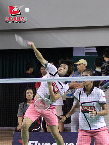 Gibertha Agnestia Suhendra yang berpasangan dengan Farah Amalia Triyani (PB Djarum) sedang berusaha mengembalikan bola dalam pertandingan melawan Ayu Wanda/Neng Wulan dari PB Exist Jakarta.