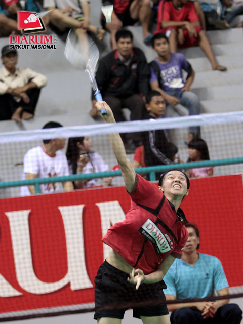 Febby Angguni sedang menunggu datangnya bola dari Rusydina Antardayu dalam pertandingan ronde kedua Tunggal Dewasa Putri yang berlangsung Kamis, (23/2) sore.