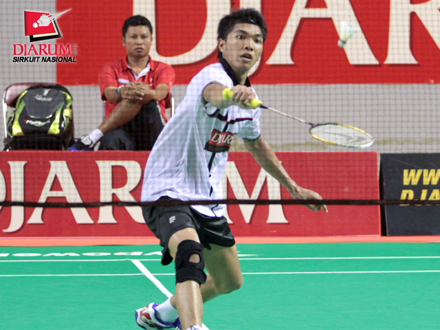 Ryan Fajar Satrio dari PB Djarum sedang memukul bola untuk dikembalikan kepada Rico Hamdani dari Tangkas Alfamart Jakarta yang menjadi lawannya dalam pertandingan Tunggal Taruna Putra.