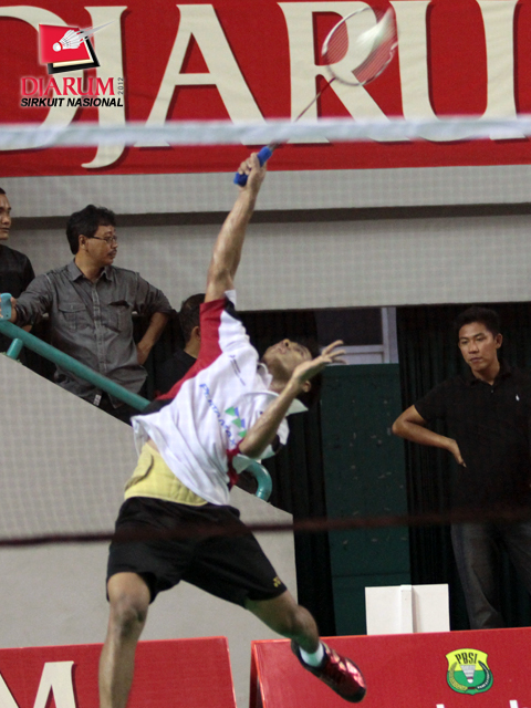 Pemain Pertamina Indonesia, Alamsyah Yunus yang menjadi unggulan pertama Tunggal Dewasa Putra sedang melakukan smash ke arah lawannya, Adityawarman dari PB Djarum. Alamsyah memenangkan pertandingan dengan perolehan skor 21-13/21-19.