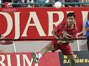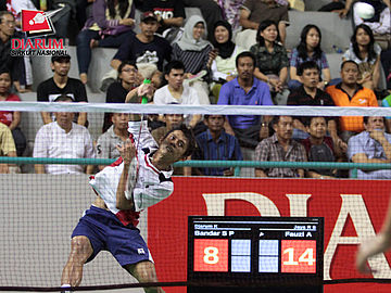 Pemain Jaya Raya Suryanaga Fauzi Adnan melakukan smash dalam pertandingan melawan Bandar Sigit Pamungkas dari PB Djarum. Fauzi menang 21-9 dan 21-11 dari Bandar.
