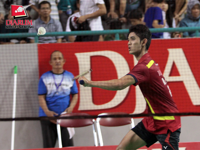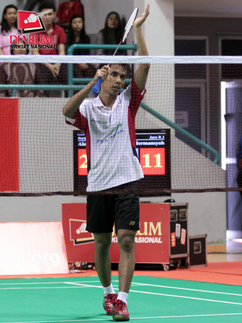 Yogi Irvans (Angkasa Prestasi Gemilang) nampak kecewa saat kok-nya gagal melewati net. Dalam pertandingan melawan Ahmad Rivai (Bank Sumsel Babel) tersebut, Yogi kalah 10-21 dan 14-21 dari Ahmad Rivai.