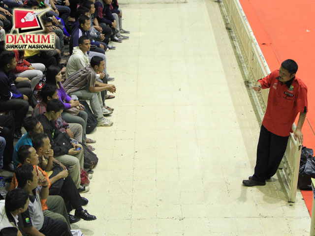 Salah seorang pelatih yang sedang memberikan pengarahan kepada para atlet saat uji coba lapangan.