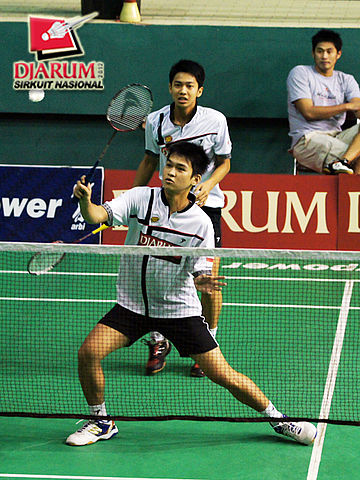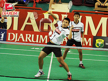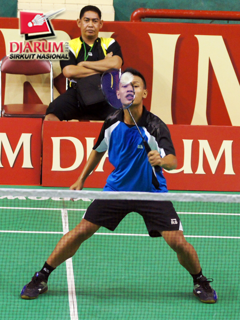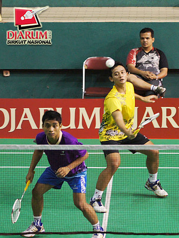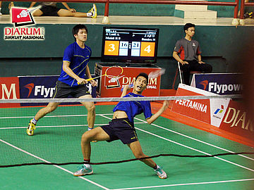 Maftuki/Yoga Sidik (Pelatprov PBSI DKI Jakarta) saat menghadang serangan dari pasangan Jeka Wiratama/Satrya Adhita (PB Djarum Kudus).