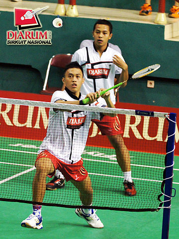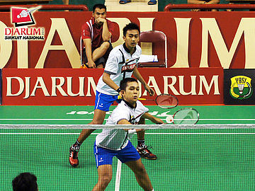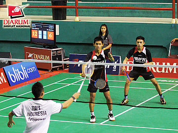 Ganda Taruna Putra Aufa Kalsel, Aldhi Septo/Maliki melepaskan serve yang kemudian langsung disambar Tedi Supriadi (PB Djarum Kudus).