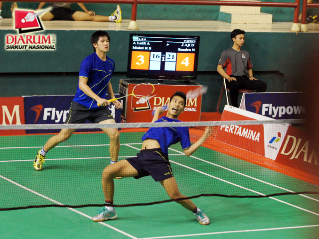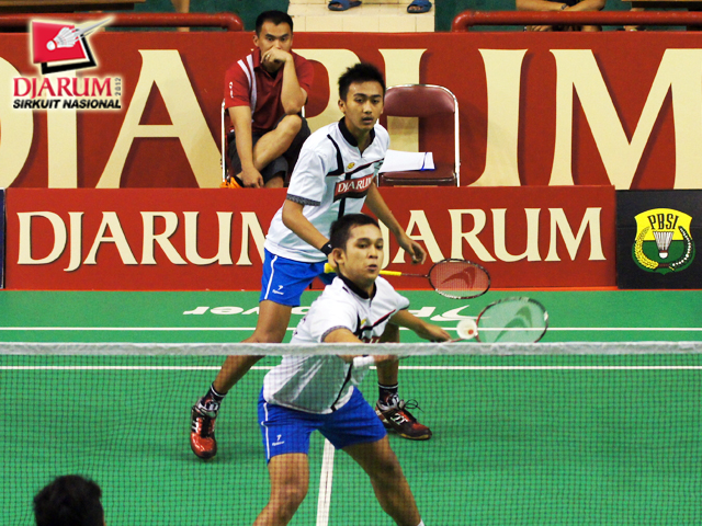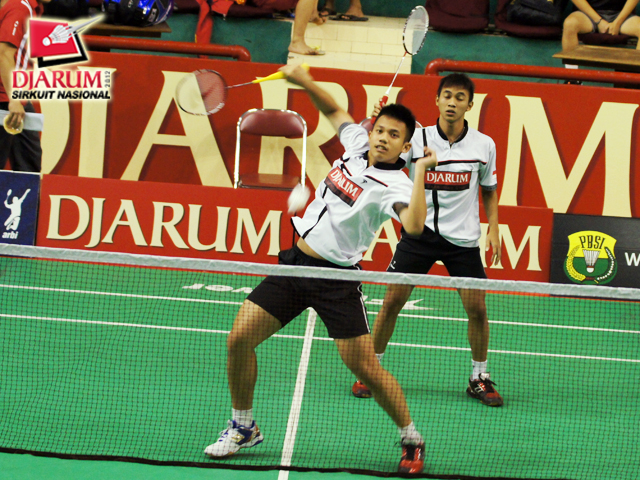 Jeka Wiratama/Satrya Adhita (PB Djarum Kudus) saat menyambut serve dari pasangan asal Platprov PBSI DKI Jakarta, Maftuki/Yoga Sidik.
