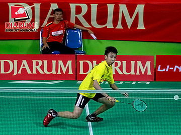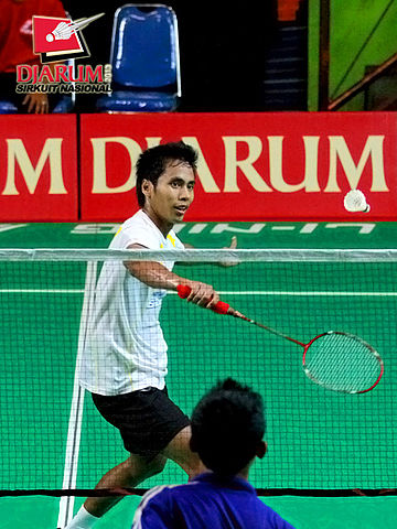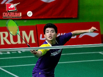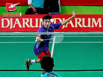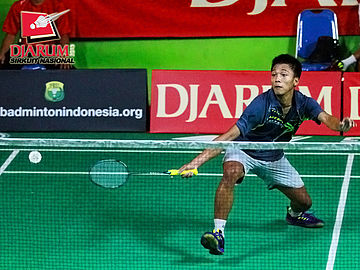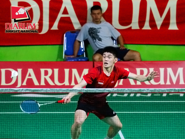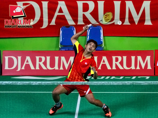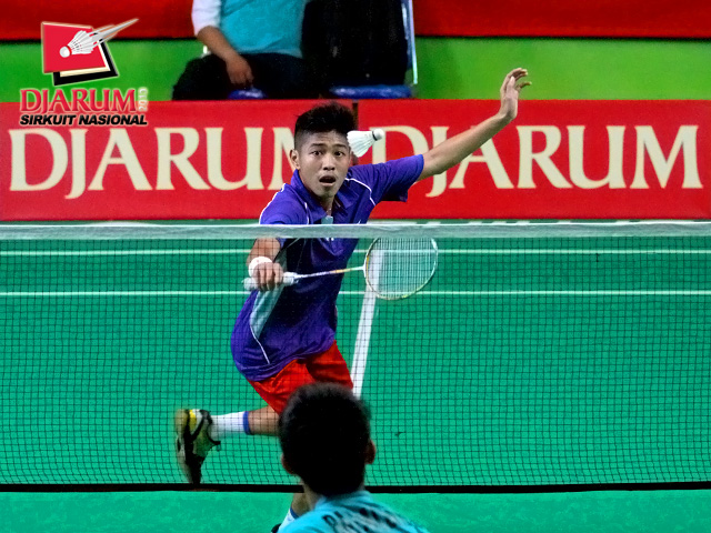 Rajid Patriawan (Pelatprov DKI Jakarta) berusaha mengembalikan kok ke arah Revindra Rayhaldi (PB Djarum).