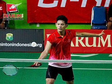 Rizky Antasari (Hi Qua Wima) mengembalikan kok ke arah Kho Henrikho (PB Djarum).