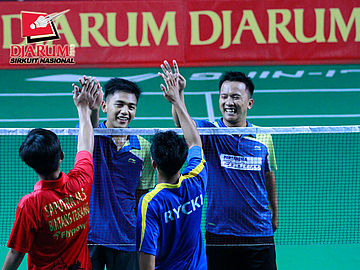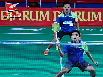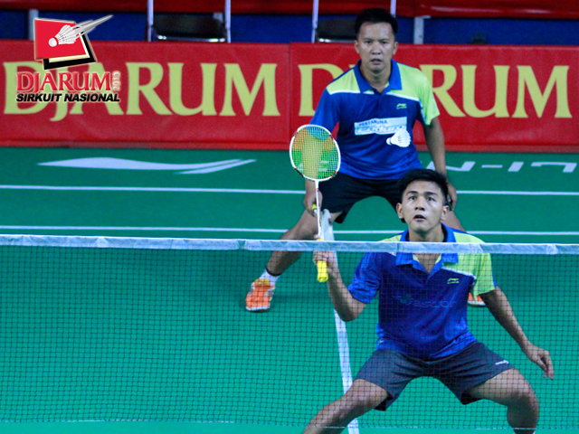 Danu Wandani/Indra Setiawan (Pertamina Indonesia) bersiap mengembalikan kok ke arah Ricky/Sony (Bintang Terang).