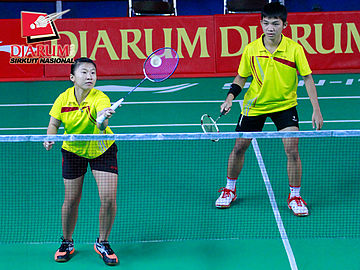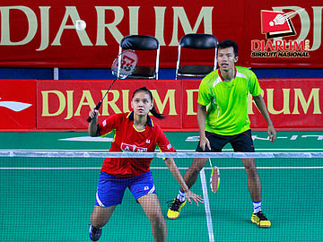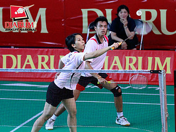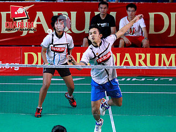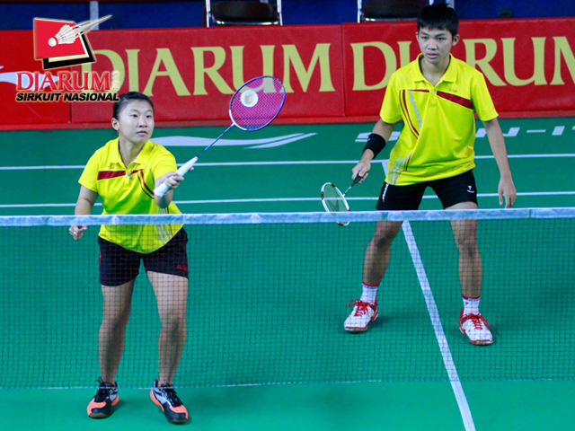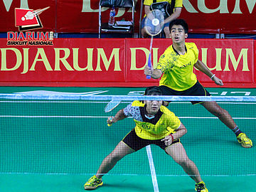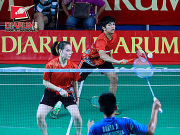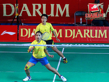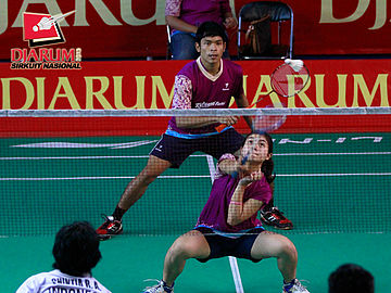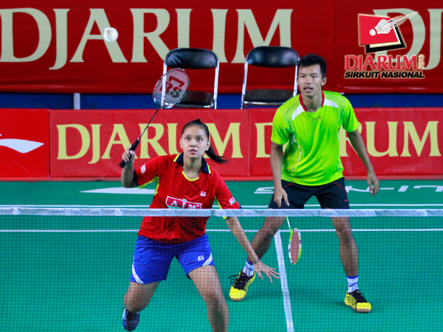 Diky Yaniadi/Dina Rahayu (SGS PLN) mengembalikan kok ke arah Vicky Rizky/Jessica Shohan (PB Djarum).