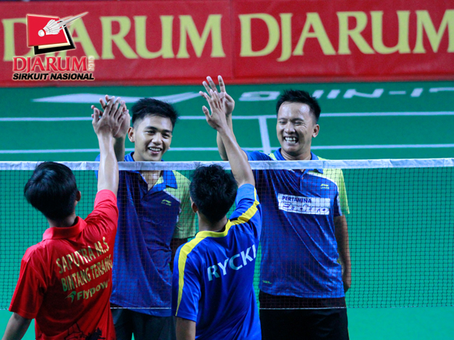 Pasangan Danu Wandani/Indra Setiawan (Pertamina Indonesia) dan Ricky/Sony (Bintang Terang) bersalaman usai bertanding.