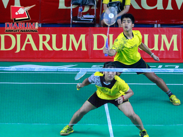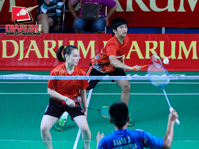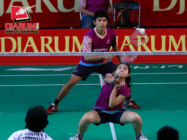 Wildan Atmaja/Nuansa Giva (Guna Dharma) menghadang serangan yang dilepaskan pasangan ganda campuran taruna PB Djarum, Jeka Wiratama/Chintia Rhizta.