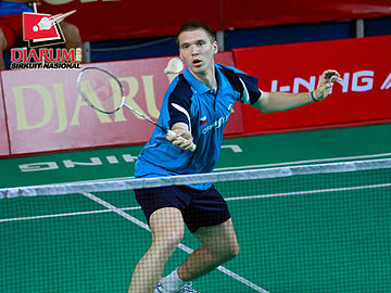 Milan Ludik (Czech Republic) mengembalikan kok ke arah Rizky Antasari (Hi Qua Wima).