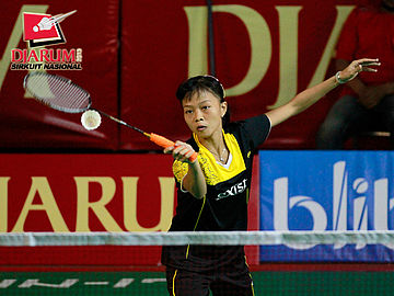 Marsa Indah (PB Djarum) mengembalikan kok ke arah Berliyan SUdrajat (Semen Gresik).