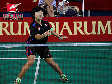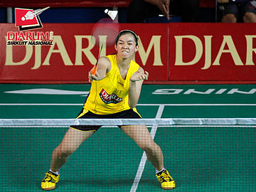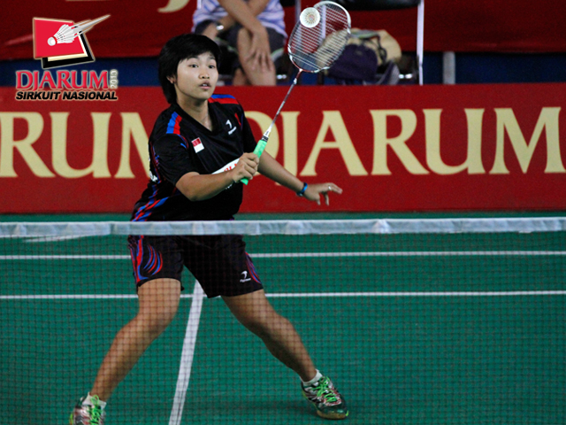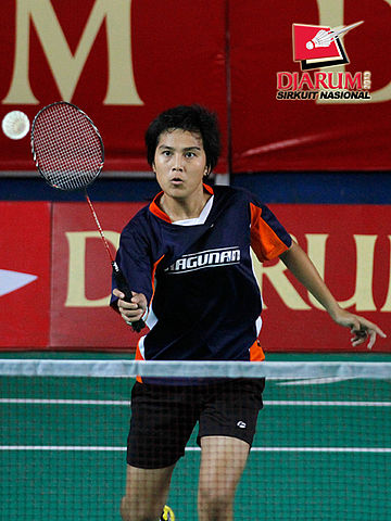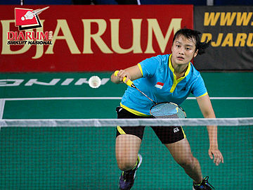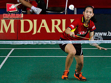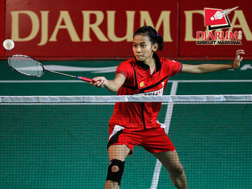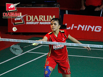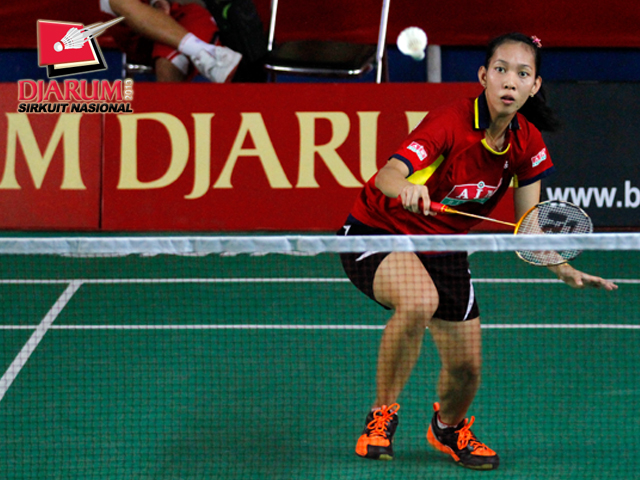 Arinda Sari (PB Djarum) berusaha mengembalikan kok ke arah Elizabeth Matindas (SGS PLN).