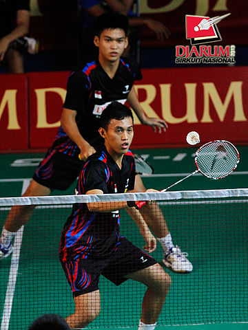 Abu Bakar/Tedi Supriadi (PB Djarum) bersiap menyambut pengembalian dari pasangan Krishna Adi Nugraha/Richard Kuncoro (Jaya Raya Suryanaga).