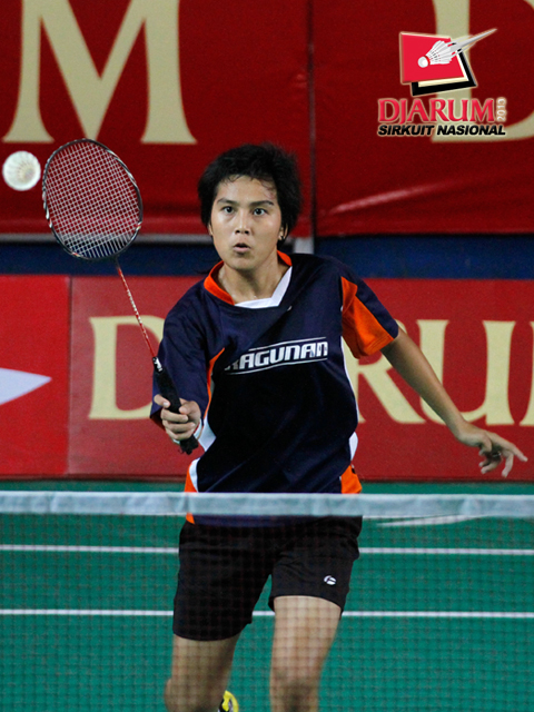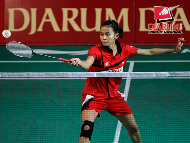 Febby Agguni (PB Djarum) mengembalikan kok ke arah Ruselli Hartawan (Pelatnas).