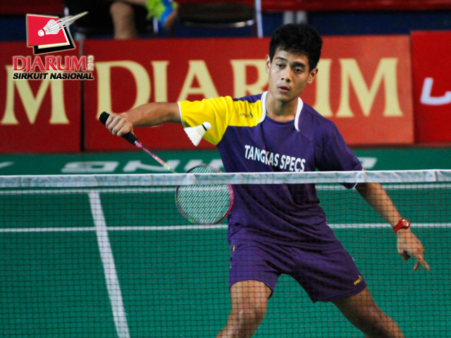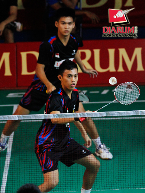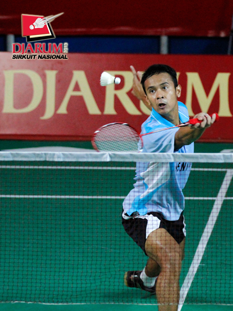 Hermansyah (Jaya Raya) mengembalikan kok ke arah Fikri Ihsandi Hadmadi (Pelatnas).