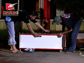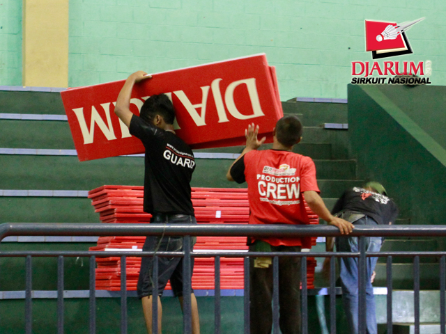 Beberapa pekerja sedang mempersiapkan booth Merchandise Djarum Sirkuit Nasional Jakarta Open 2013.