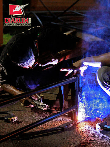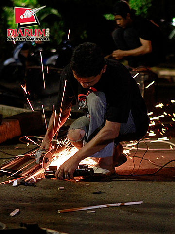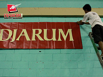 Seorang pekerja sedang mempersiapkan banner Djarum.