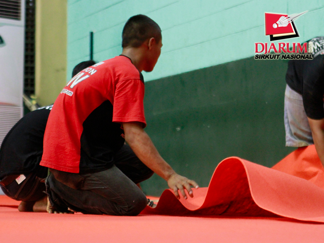 Para pekerja sedang mempersiapkan karpet lapangan di Hall Bulutangkis Asia Afrika.