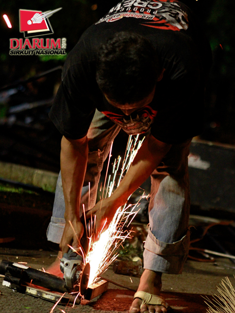 Seorang pekerja sedang mempersiapkan booth Merchandise Djarum Sirkuit Nasional Jakarta Open 2013.