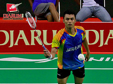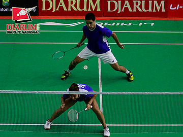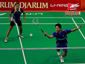 Ahmad Rivai/Aris Budiharti (Bank sumsel/Jaya Raya Jakarta) mencoba mengembalikan kok ke arah Ryo Arief/Aan D C (Hiqua Wima).