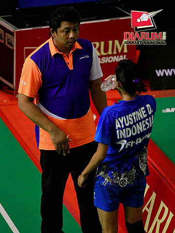 Dinar Dyah Ayustine (Djarum Kudus) sedang diberi arahan oleh pelatih.
