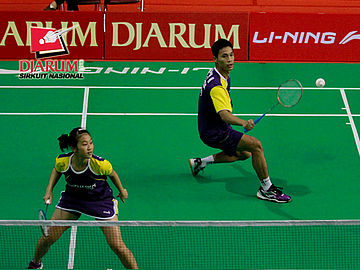 Jonathan Jose Solis/Nikte Sotomayor (Guatemala) bersiap mengembalikan smash dari Marcus Fernaldi Gideon/endang Nursugianti (Tangkas Specs).