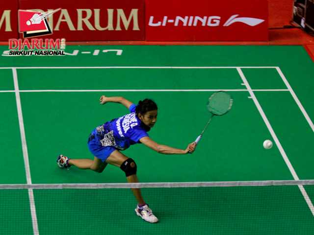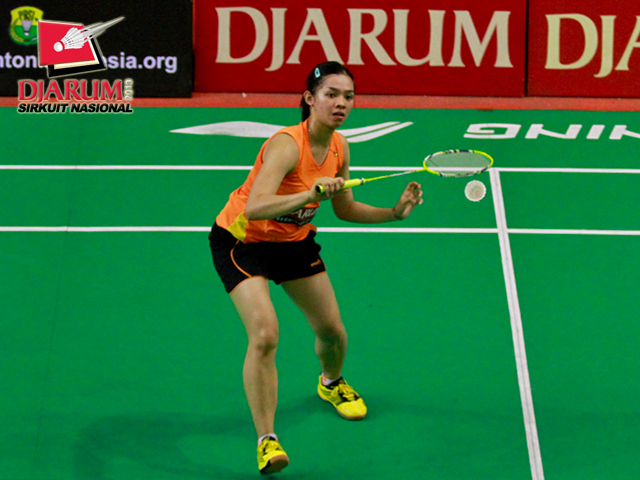 Febby Angguni (Djarum Kudus) mengembalikan kok ke arah lawan.