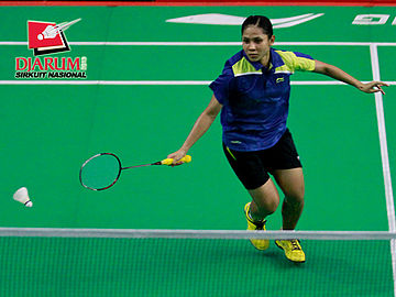 Ganis Nurahmandani (Pertamina) mengembalikan kok ke arah Ruselli Hartawan.